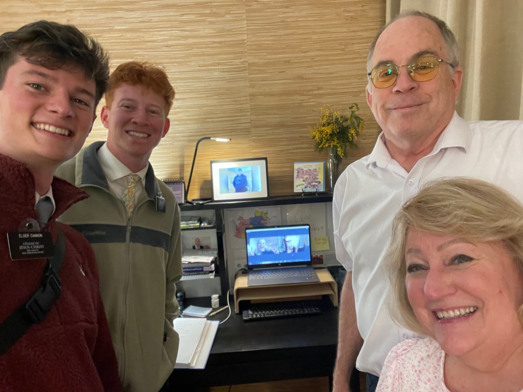 Before the transfer confusion begins, the president holds a mission-wide zoom meeting for all missionaries in the mission. In this meeting, Sister Léporé talked about Joy in the Savior. We know that He pleads our cause and joy is a gift as we bind ourselves to Him. President Léporé talked about “Look” moments. In Nephi’s vision (1 Nephi 11 – 14), he was invited many times by his attending angel to “Look”. As Nephi “Looked”, he beheld many events that had unfolded before and that for him would take place in the future. Each time he “Looked”, the angel showed him more of the future of the world and the role of the Savior in all that transpires. President Léporé invited each of us to “Look”; be aware of the events transpiring around us. Be aware that all of this is the fulfillment of Scripture. Nephi was invited to “Look”, and he saw the very events swirling around us. President Léporé described the results of acting in faith from the challenges given at the last Zone conference. Though the numbers tell only a small part of the story, indicators in the mission are doubling and doubling again.